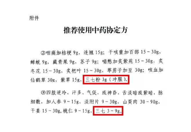 在2020年2月2日武漢市新冠肺炎防控指揮部醫(yī)療救治小組關(guān)于推薦使用中藥的協(xié)定方名單中二處使用三七,并強(qiáng)調(diào)2020年2月3日24時前確保所有患者使用中藥。