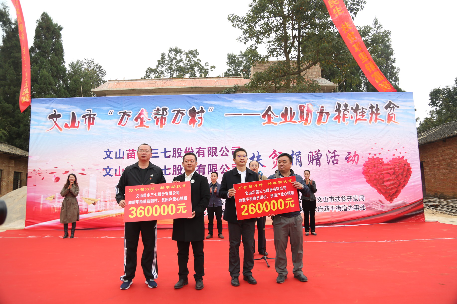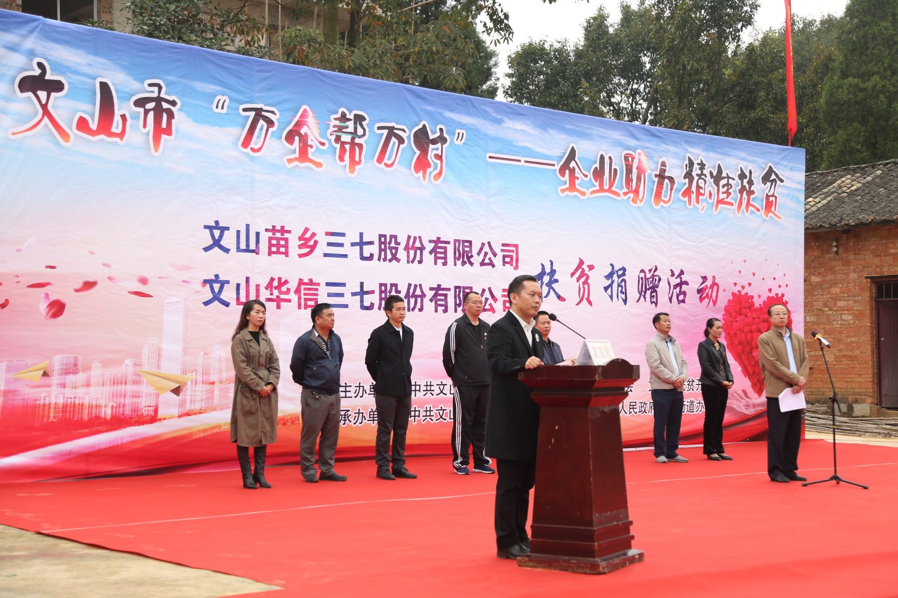 2017年11月18日,苗鄉(xiāng)三七董事長(zhǎng)余育啟、副總經(jīng)理田藝、董事長(zhǎng)助理熊婷等代表苗鄉(xiāng)三七積極參與了文山市民營(yíng)企業(yè)“萬(wàn)企幫萬(wàn)村”——精準(zhǔn)扶貧活動(dòng),并向文山市新平街道迷灑社區(qū)新發(fā)寨村捐贈(zèng)資金36萬(wàn)元幫助進(jìn)村道路建設(shè)及建檔立卡貧戶(hù)危房改造。精準(zhǔn)扶貧作為各級(jí)黨委政府的核心工作之一,苗鄉(xiāng)三七作為產(chǎn)業(yè)化龍頭企業(yè),責(zé)無(wú)旁貸地積極參與其中履行社會(huì)責(zé)任,以實(shí)際行動(dòng)投身精準(zhǔn)扶貧,為建設(shè)和諧文山,打贏脫貧攻堅(jiān)戰(zhàn)貢獻(xiàn)一份力量。